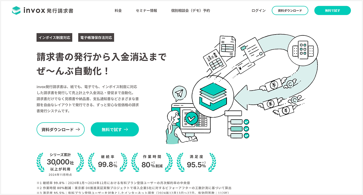 その結果、サービス継続率は99.8%以上(※1)と高い継続率を維持している。 - 1サービスで、請求書の作成から売上計上、入金消込まで全てが完結するため、手軽に周辺業務まで効率化ができる。